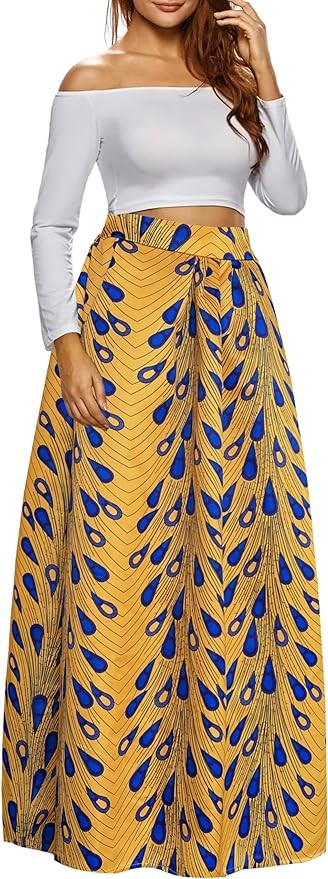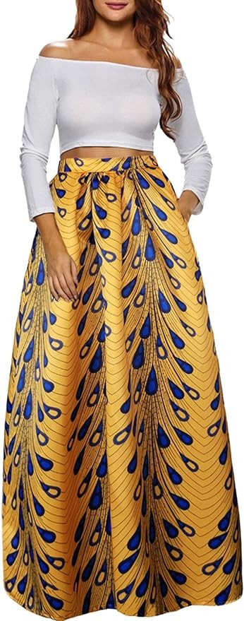 Afibi Women African Printed Maxi Skirt Flared Skirt A Line Long Skirts with Pockets S-5XL
