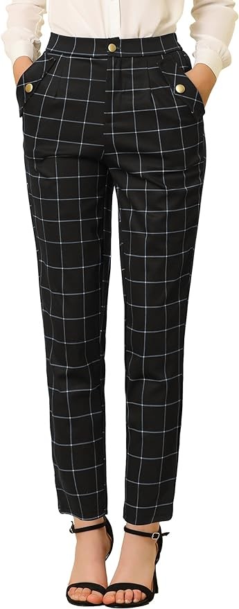 Allegra K Women's Vintage Tartan Plaid Pants Elastic Waist Straight Long Trousers