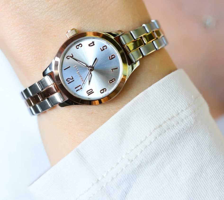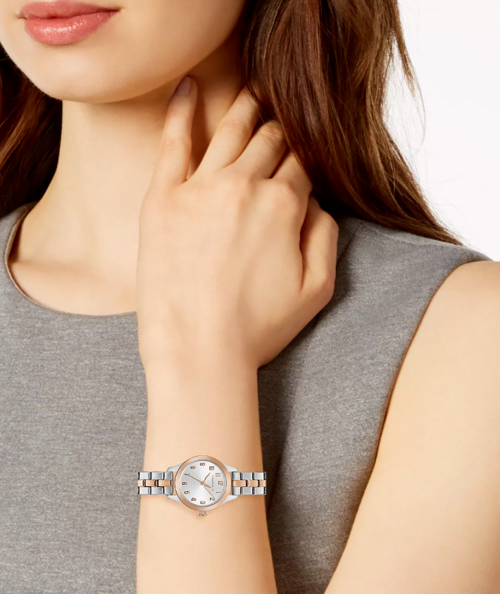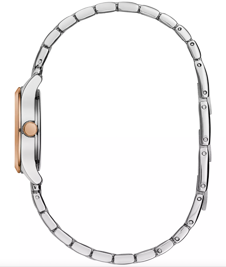 Less is more with this gracefully proportioned rose gold-tone accented stainless steel case with easy-to-read numerals on silver-white sunray dial. Alternating polished and brushed three-link stainless steel bracelet with rose gold-tone accents and jewelers clasp closure.