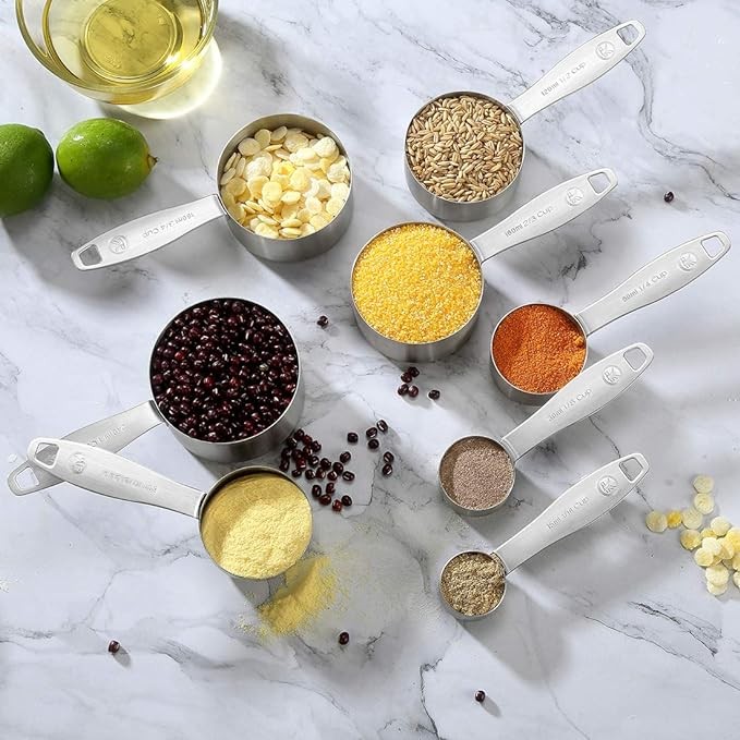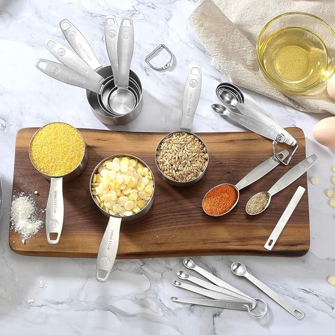 • [Beautiful Design] Our measuring spoons and cups set makes a perfect gift for wedding, holiday or housewarming parties. Long handles to allow even clumsy fingers to hold tight. Conveniently nests inside one another design and two rings allowing you to store them in any drawer, cabinet or cupboard.