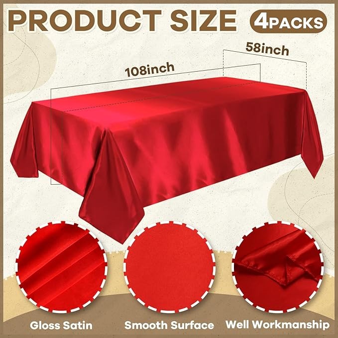 • Size & Color - Satin Table Cover:With 4 packs of red satin tablecloth in each package, each satin rectangle tablecloth is about 58 inch wide and 108 inch long, large enough to decorate a table accommodating about 8-10 persons, providing a comfortable and elegant dining environment for your guests.