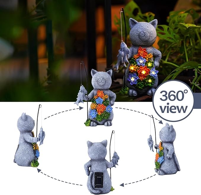 【Be different from others】Our cat statue has a fishing look, and the flowers on the cat will glow at night, adding a beautiful shape to your garden and making your yard even more attractive